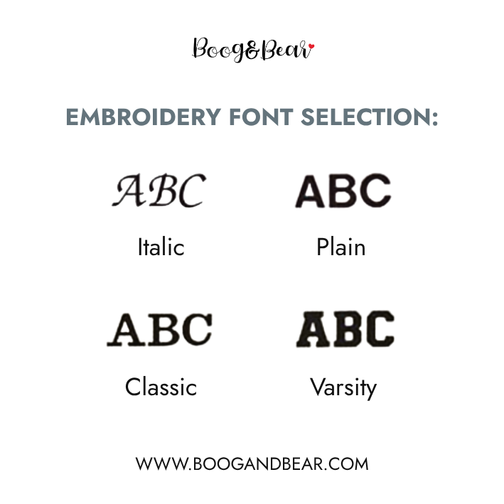 Choose whatever you would like on the front of your bag including your font. We lay the writing across the top of the back to fit the print area. Please note that the more characters/words the smaller the font will be.